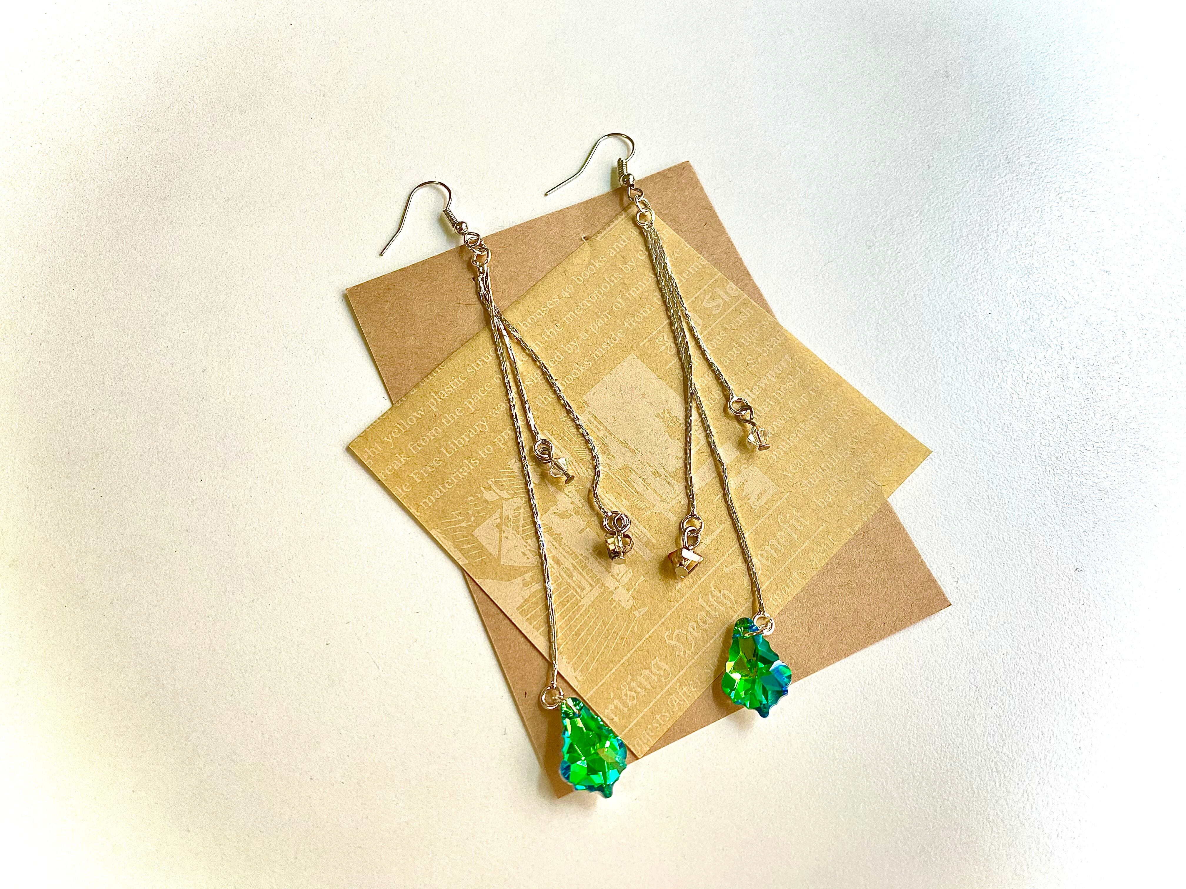 ロングチェーンの先にキラキラの雫グリーンモチーフがアクセントになった、華やかな耳元を演出してくれるロングピアスです。