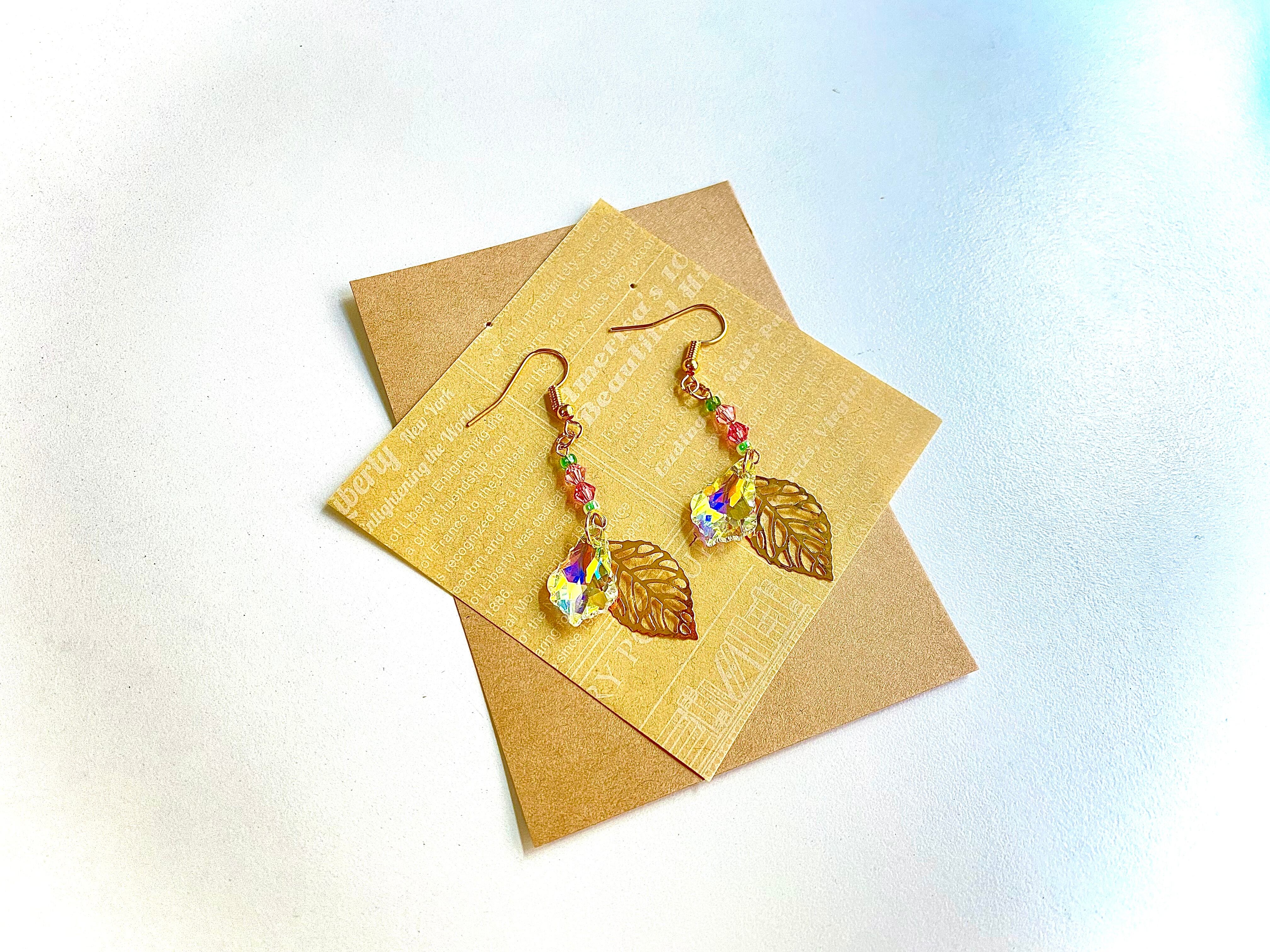 葉っぱのモチーフと、雫型オーロラクリスタルがキュートで可愛い華やかな耳元を演出してくれるピアスです。