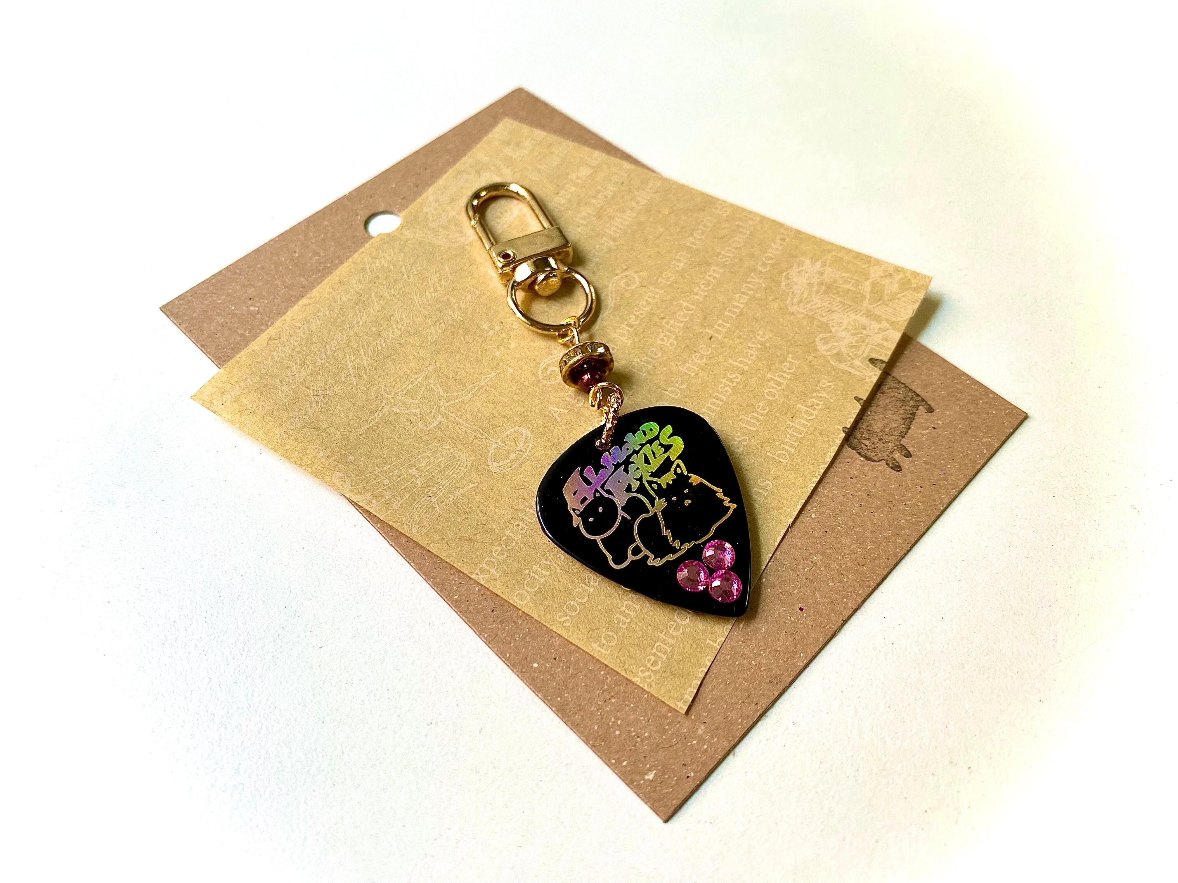 カラースタッズをあしらったオリジナルピックを使用したキーホルダーです。