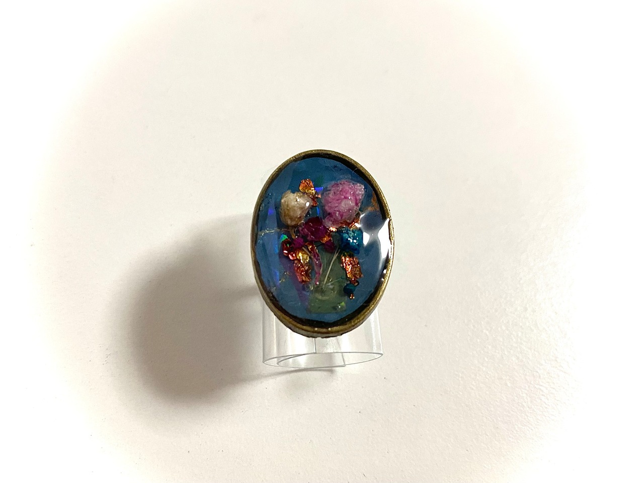 【リング】ドライフラワーを閉じ込めたアンティーク風のレジンリング(ブルー)